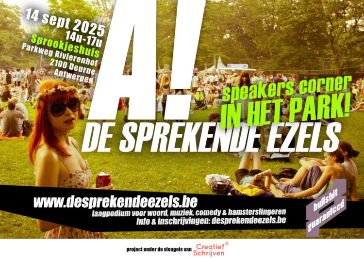 Op zondag 14 september kun je deelnemen aan onze exclusieve non-stop-drie-uur-durende Speakers Corner aan het prachtige Sprookjeshuis in het park Rivierenhof in Deurne. Een gezellig zomers mini-openluchtpodium in het kader van het vertelfestival ‘Park vol Verhalen’ dat Creatief Schrijven op poten zet ism met De Vertellers van het Sprookjeshuis en Sering vzw (https://creatiefschrijven.be/activiteiten/park-vol-verhalen).